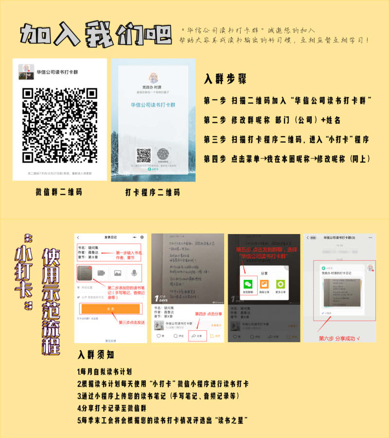 活動(dòng)最后,為幫助大家養(yǎng)成讀書輸出的好習(xí)慣,工會(huì)建立了“華信公司讀書打卡群”并邀請(qǐng)廣大會(huì)員加入,依托微信程序“小打卡”進(jìn)行線上讀書分享,每日上傳讀書筆記、感悟等,季末評(píng)選出一名“讀書之星”。會(huì)員們紛紛表示,線上+線下結(jié)合方式十分新穎,能夠起到互相監(jiān)督、互相學(xué)習(xí)的作用。